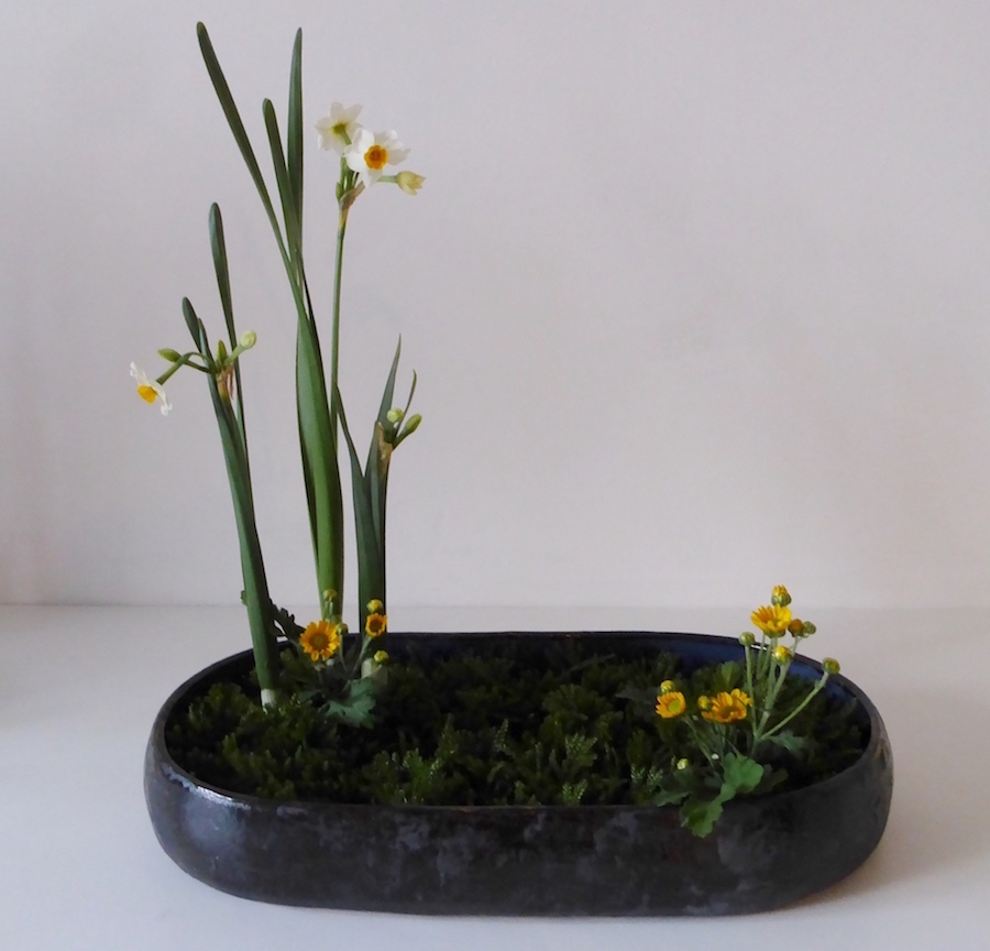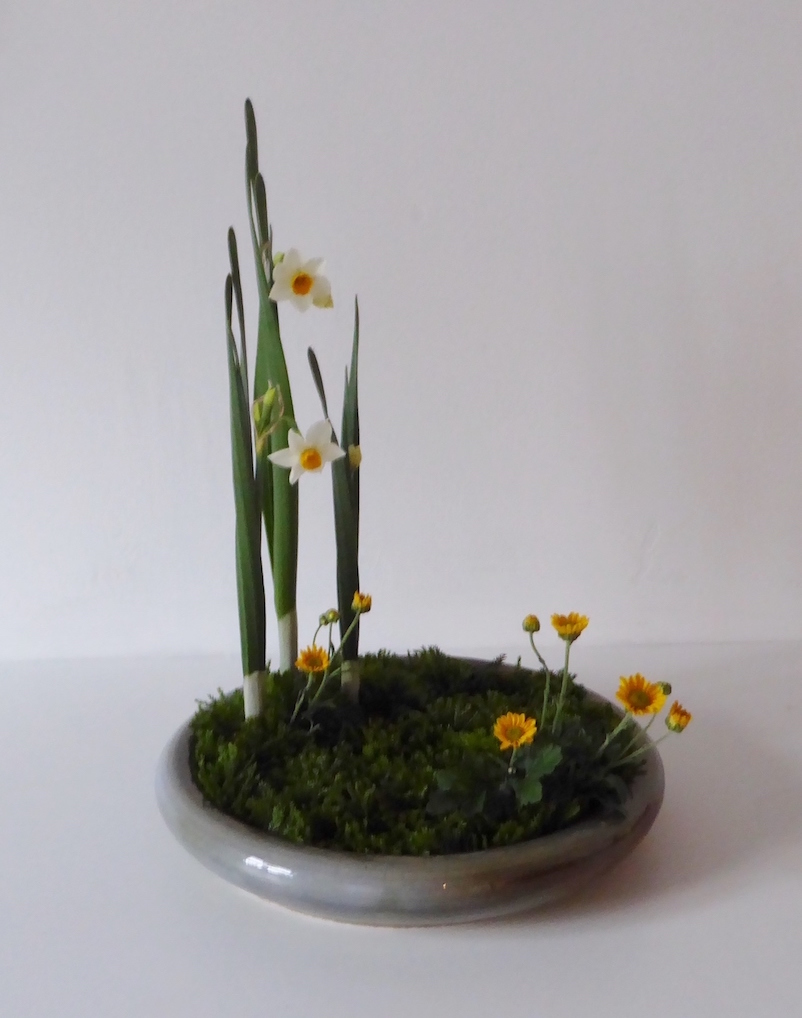 Bij een ‘Traditioneel landschap‘ is de wijze van schikken van de narcissen aan strenge regels gebonden. Een narcisgroep bestaat steeds uit vier bladeren en een steel met bloemen. In zo ’n landschap kunnen drie, vijf of zelfs zeven narcisgroepen voorkomen gecombineerd met andere materialen. De deelnemers hebben de variant met drie narcisgroepen gemaakt.