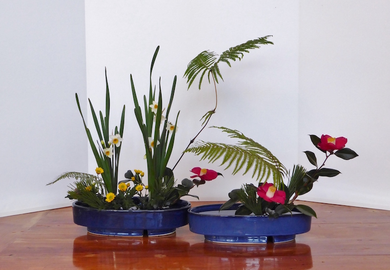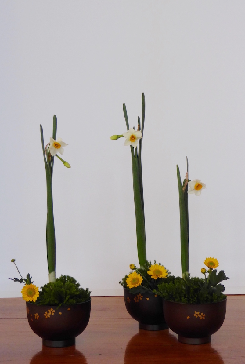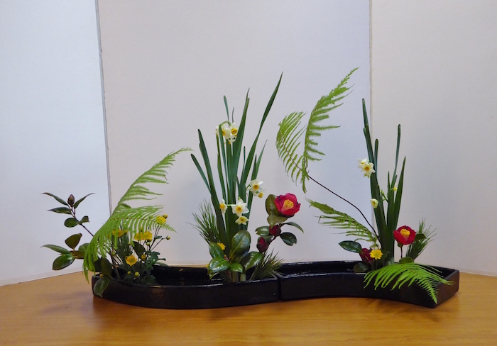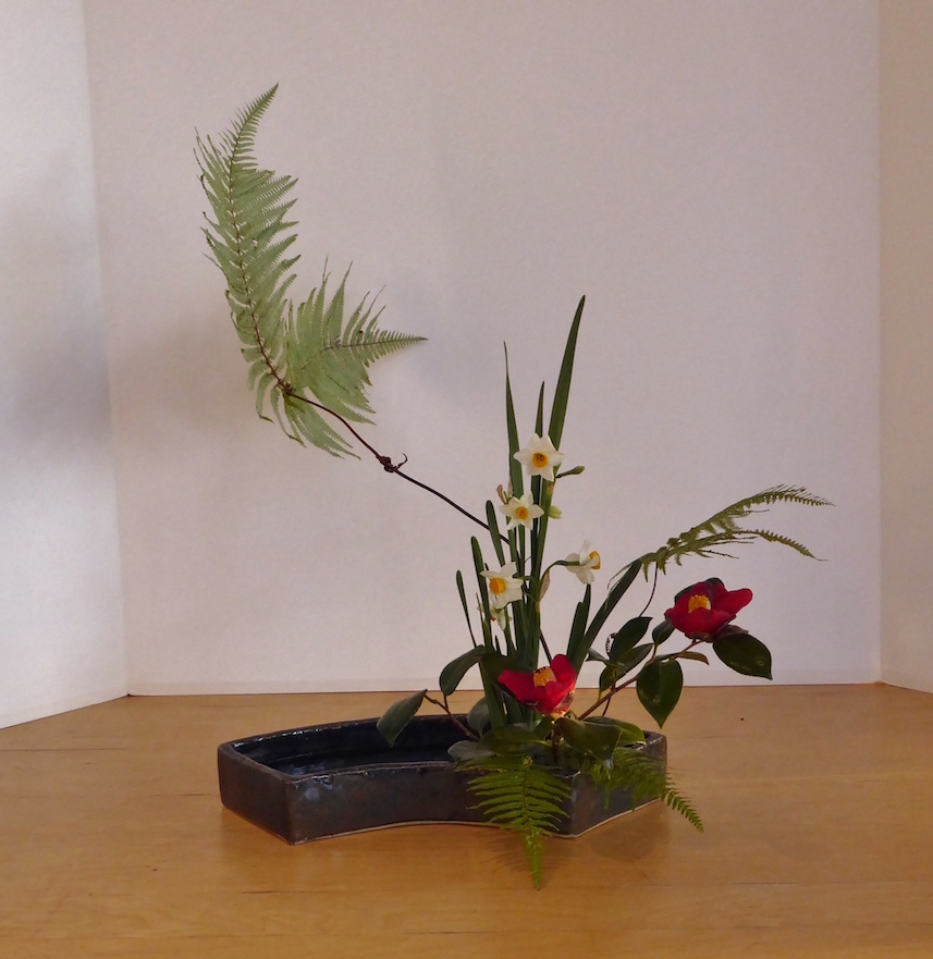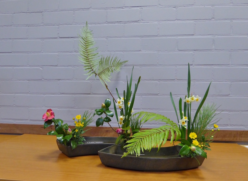 Voor de Rimpa tijdens de workshop werden weer Japanse narcissen gebruikt, maar nu naar hun natuurlijke groeiwijze geschikt. Daarnaast werd er gebruik gemaakt van Camellia, winterchrysanten en Gleichenia japonica, een Japanse varensoort.