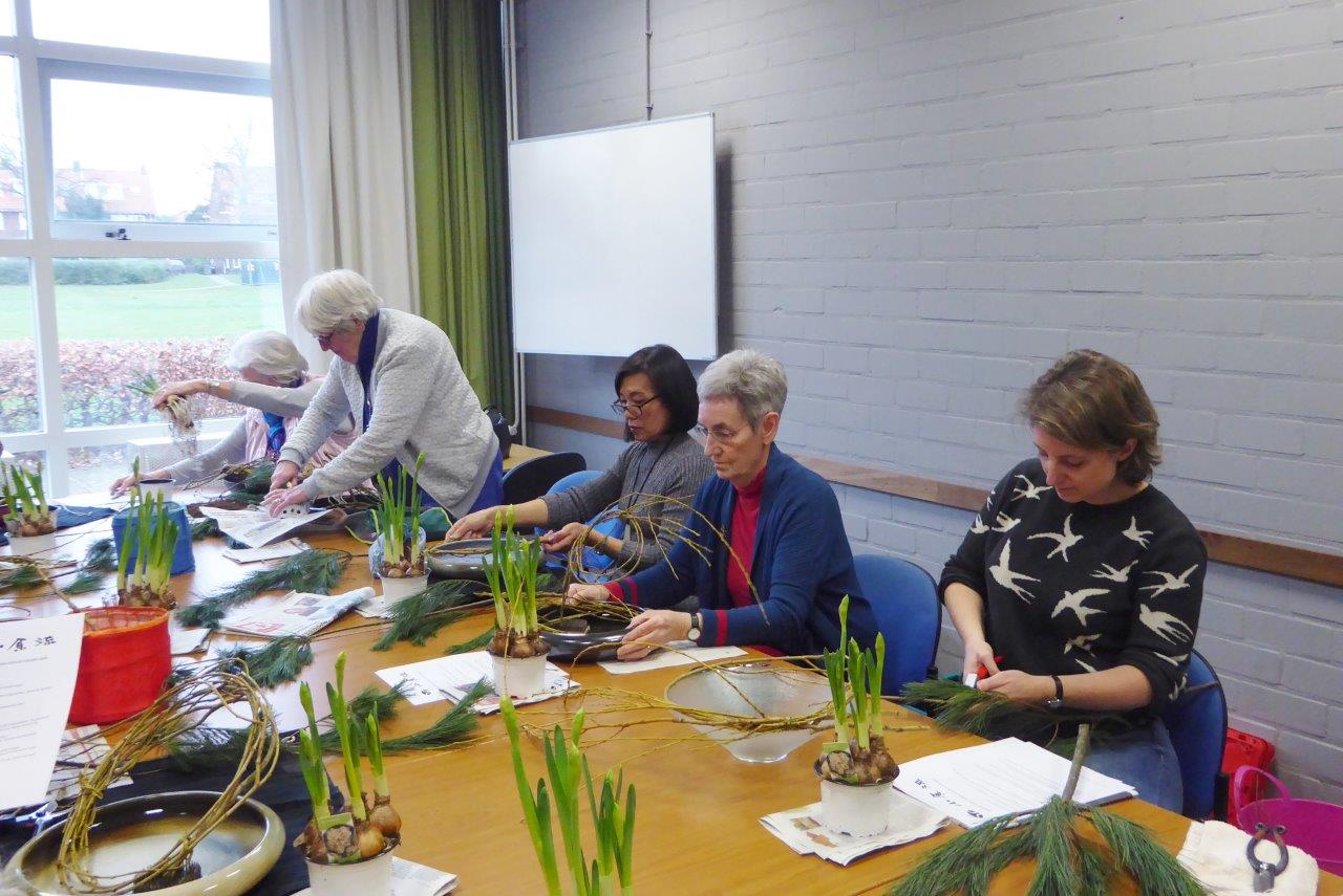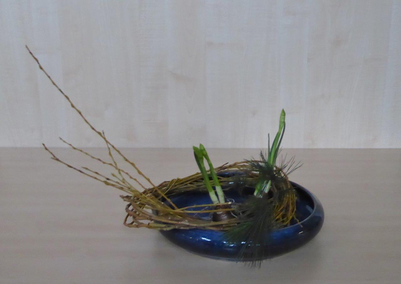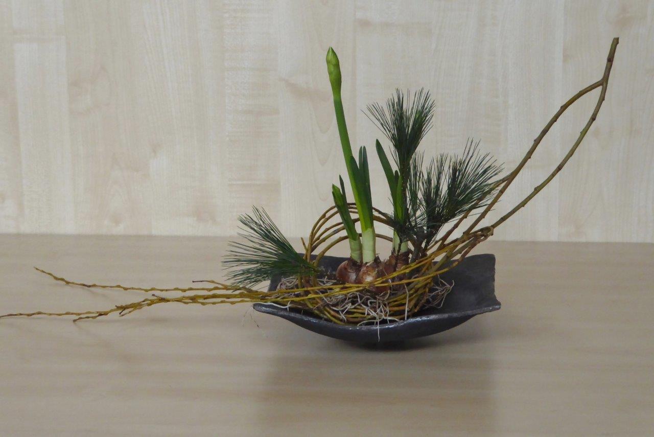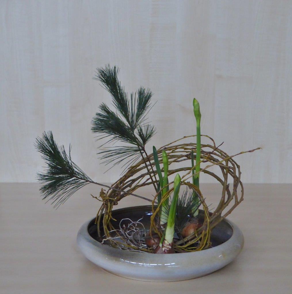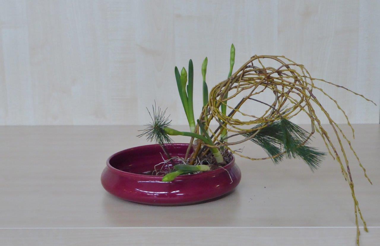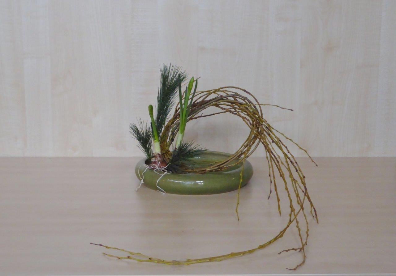 Tijdens de eerste workshop van ons Chapter in 2018 hebben de deelnemers een schikking voor het nieuwe jaar gemaakt waarbij als materiaal Pinus, narcissen en takken van de treurwilg werd gebruikt. De lange takken van de treurwilg worden in een bundel bij elkaar genomen. De knoop die erin gelegd wordt, betekent vriendschap.De workshop vond plaats op 6 januari in wijkcentrum Agora, Voorburg onder leiding van Conny van Dongen en Noriko van Lit.
