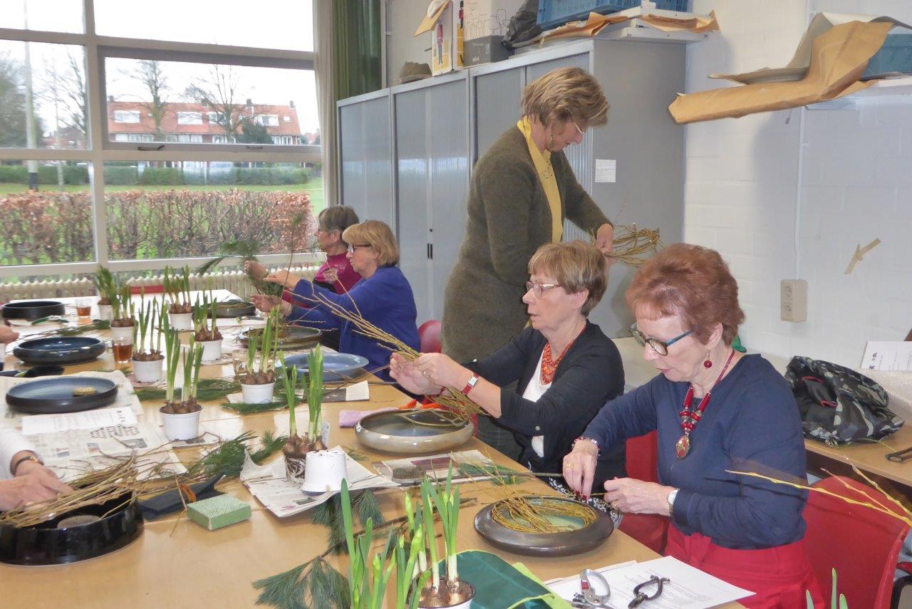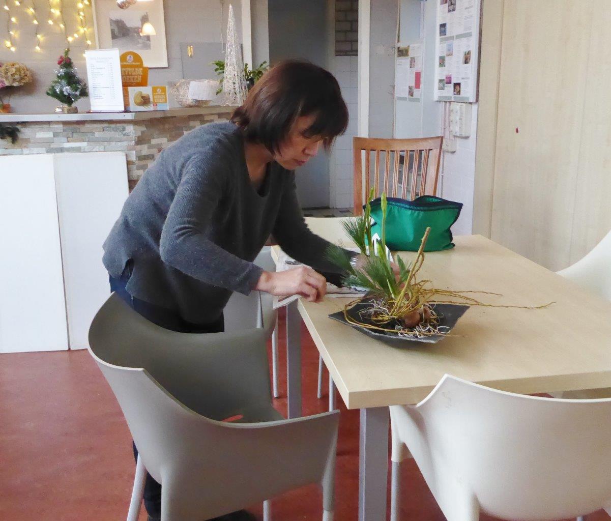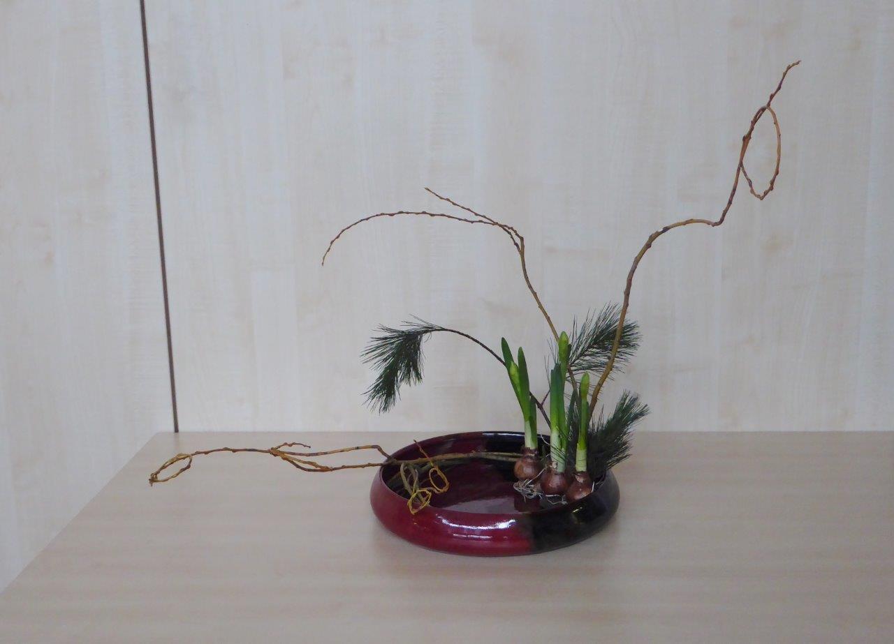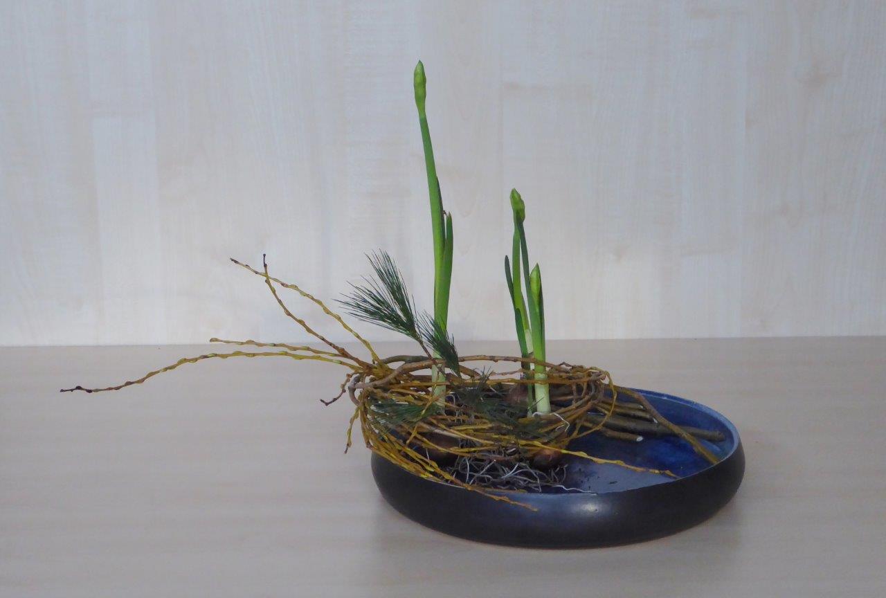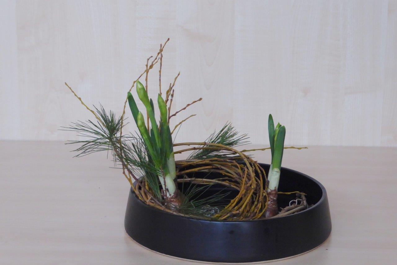 Tijdens de eerste workshop van ons Chapter in 2018 hebben de deelnemers een schikking voor het nieuwe jaar gemaakt waarbij als materiaal Pinus, narcissen en takken van de treurwilg werd gebruikt. De lange takken van de treurwilg worden in een bundel bij elkaar genomen. De knoop die erin gelegd wordt, betekent vriendschap.De workshop vond plaats op 6 januari in wijkcentrum Agora, Voorburg onder leiding van Conny van Dongen en Noriko van Lit.