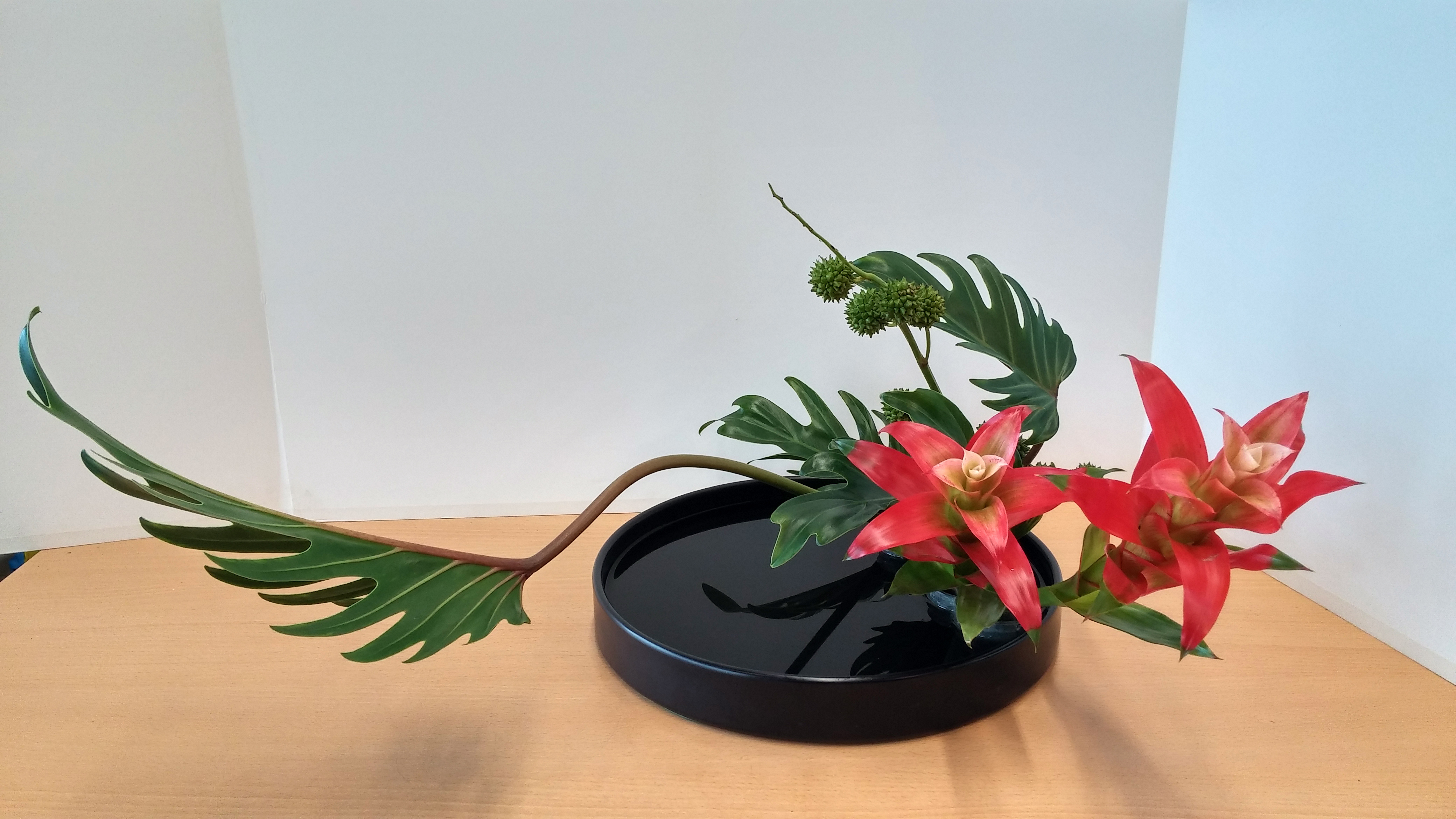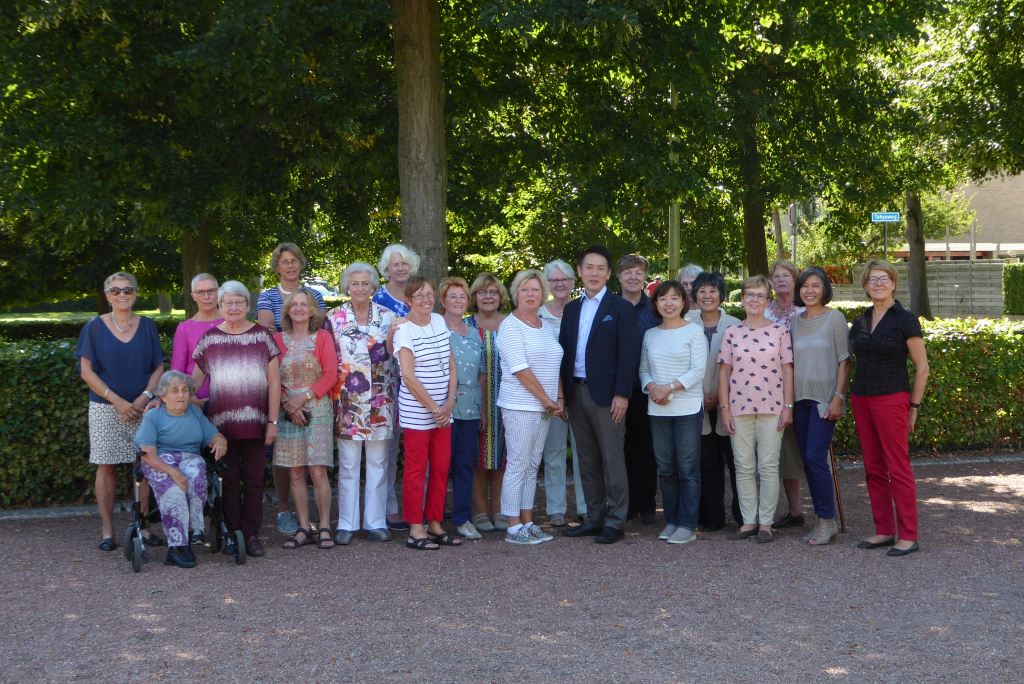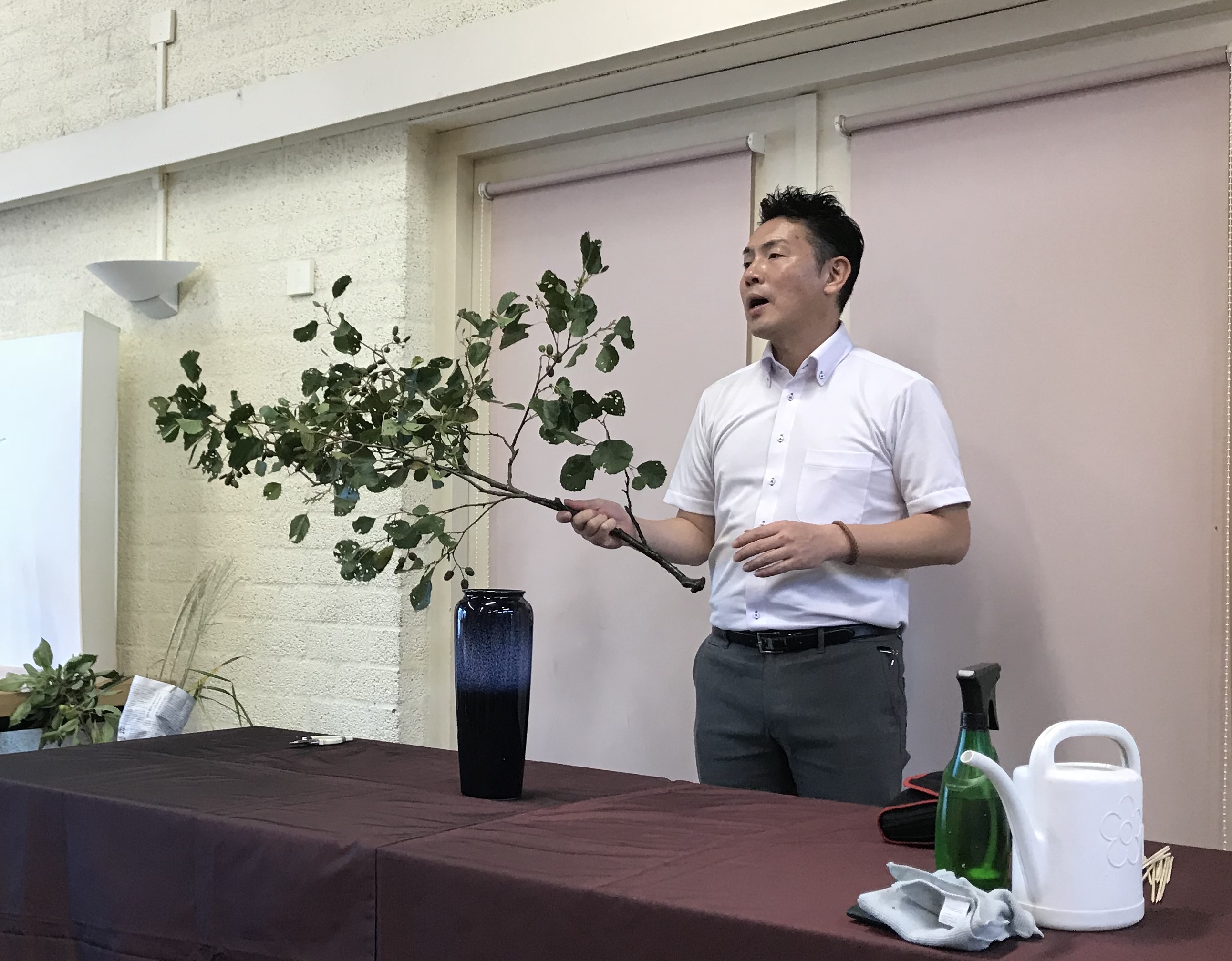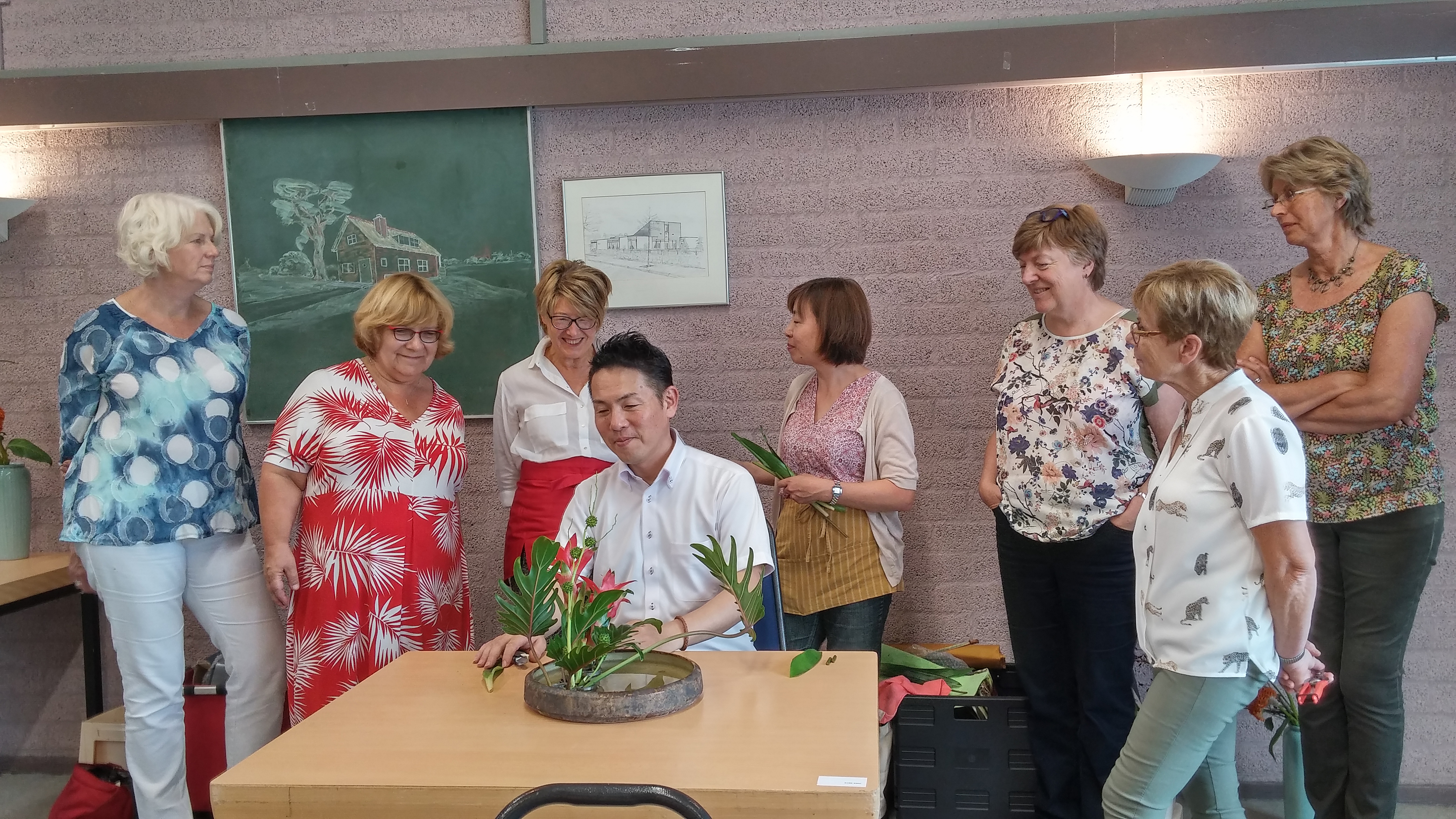 Satoshi Hirota, assistant professor van de raad van professoren van de Ohara School Tokyo heeft vier workshops gegeven aan leden van het Nederlandse Ohara Chapter. De workshops vonden plaats op 17 en 18 augustus 2018 in buurtcentrum De Boschbloem te Voorschoten. Op het programma stonden: een realistisch landschap, een Hiraku (radiale vorm), een Heika (schikking in een hoge vaas) en een Moribana waterreflecitng (schikking in een schaal). Professor Hirota gaf bij elke schikking een duidelijke uitleg en een demonstratie. Hij betoonde zich een vriendelijk en behulpzaam man en het ontbrak hem niet aan het nodige gevoel voor humor. De deelnemers hebben vol enthousiasme in een prima sfeer aan hun schikkingen gewerkt.