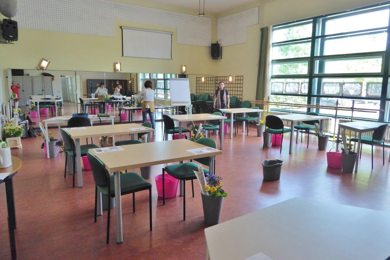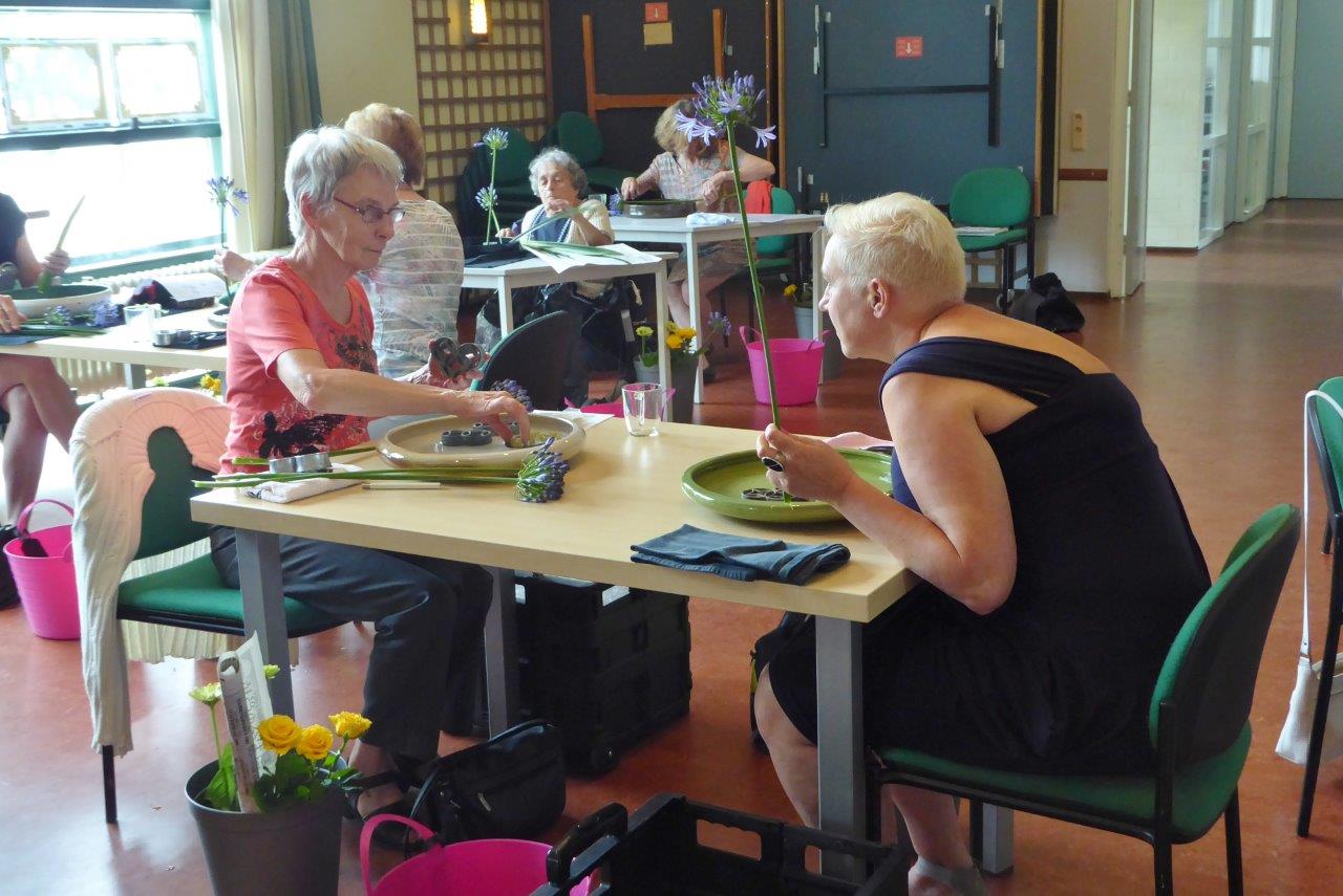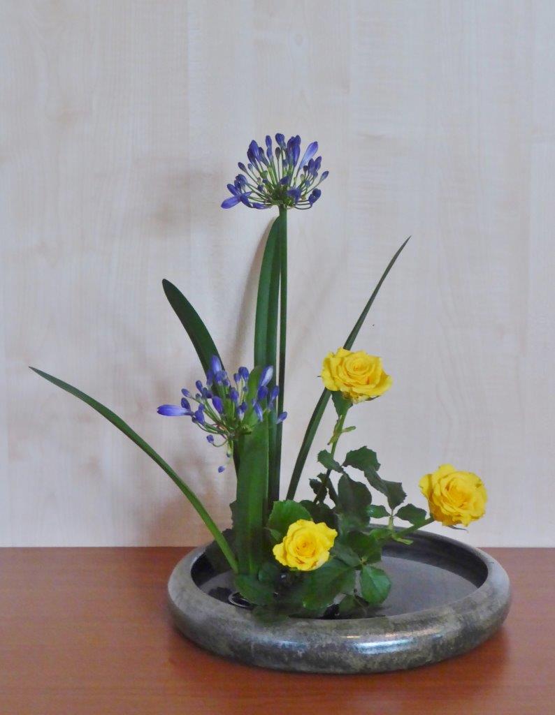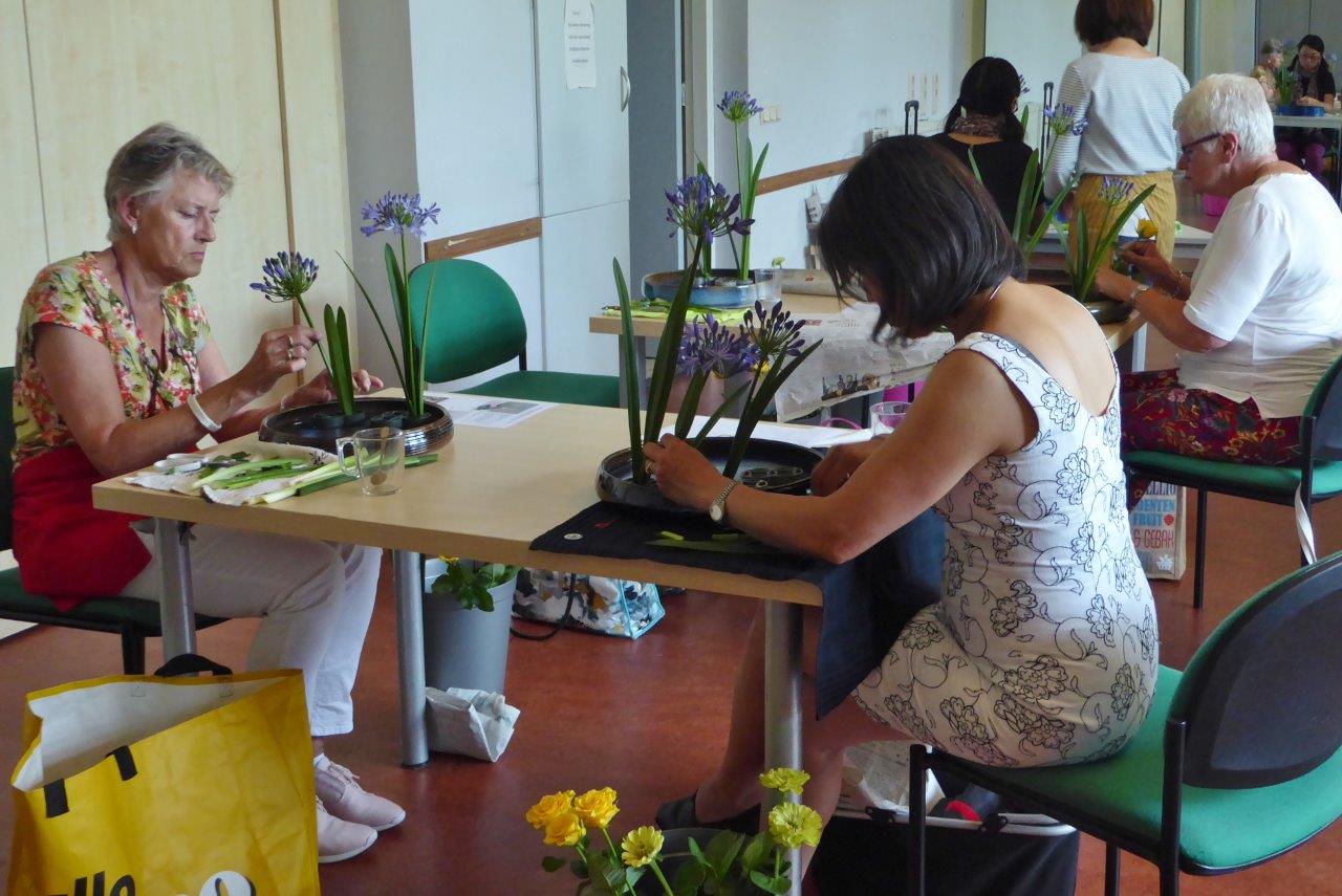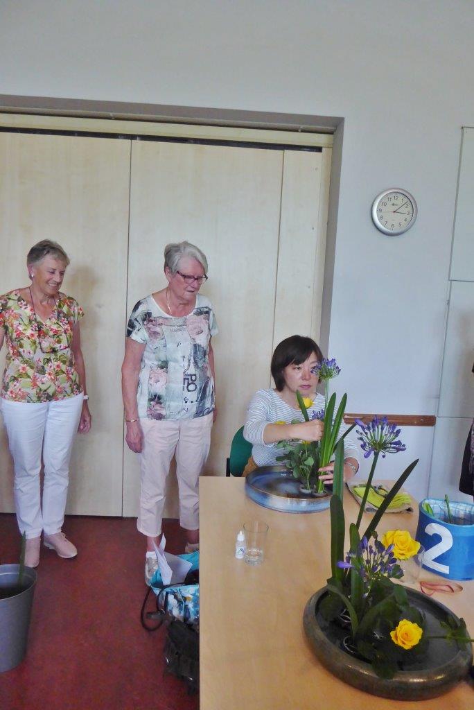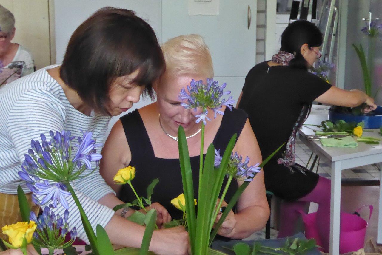 De schikking werd gemaakt met twee of drie materialen afhankelijk van het niveau van de deelnemers: naast Agapanthus nog rozen of Agapanthus, rozen en Zinnia ‘s.