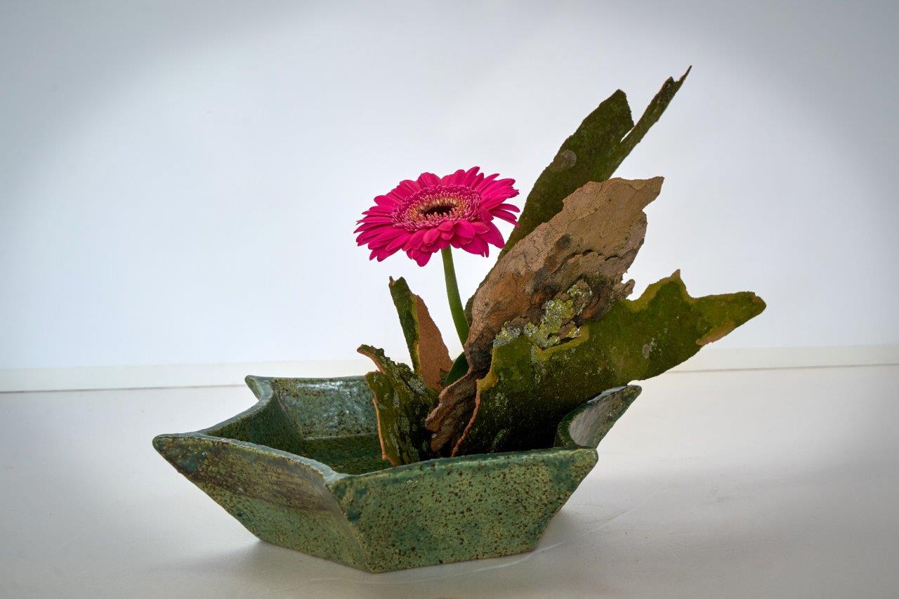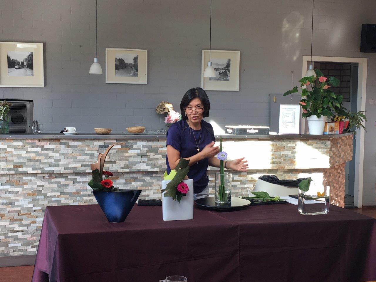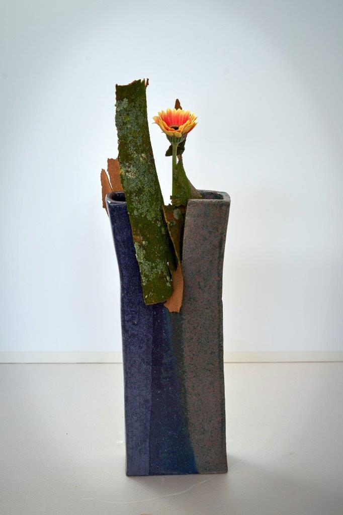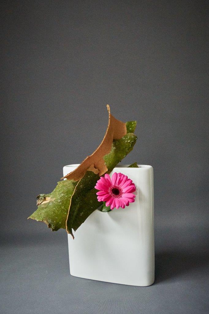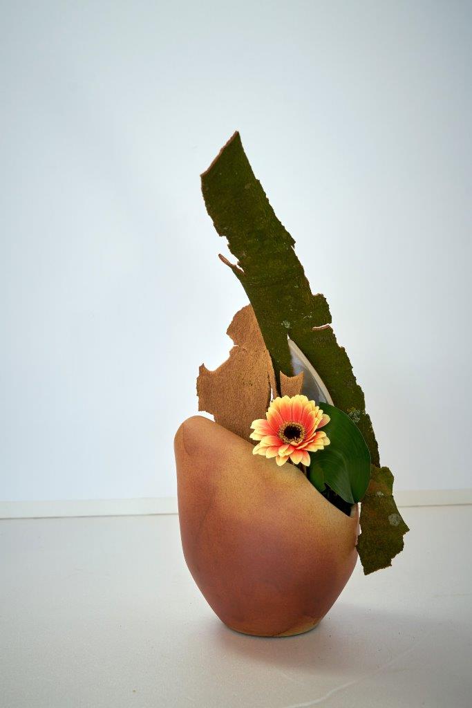 Vrije stijl in de Ohara School is niet zo eenvoudig te omschrijven. Maar misschien is dat wel het aantrekkelijke ervan. Er is veel vrijheid bij het maken van de schikking. De stijl is Irene Kho “op het lijf geschreven” en onder haar enthousiaste begeleiding hebben achttien leden van het Ohara Chapter een aantal leuke schikkingen gemaakt. Het hoofdmateriaal was schors van de Plataan. Als kleurig accent werden zonnebloemen of Gerbera ’s gebruikt. Een tweede schikking werd gemaakt in een glazen cilinder.