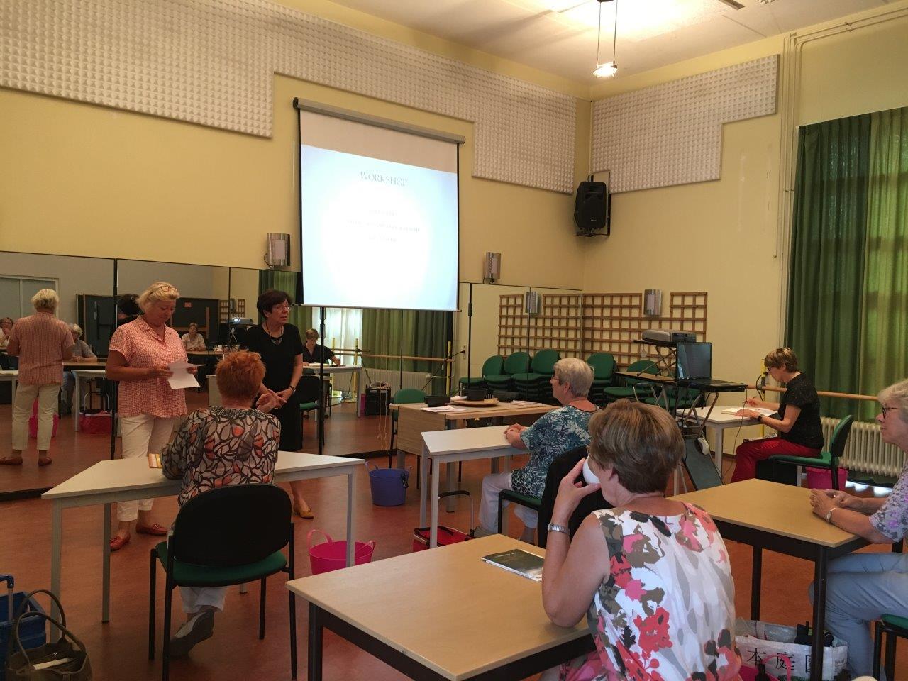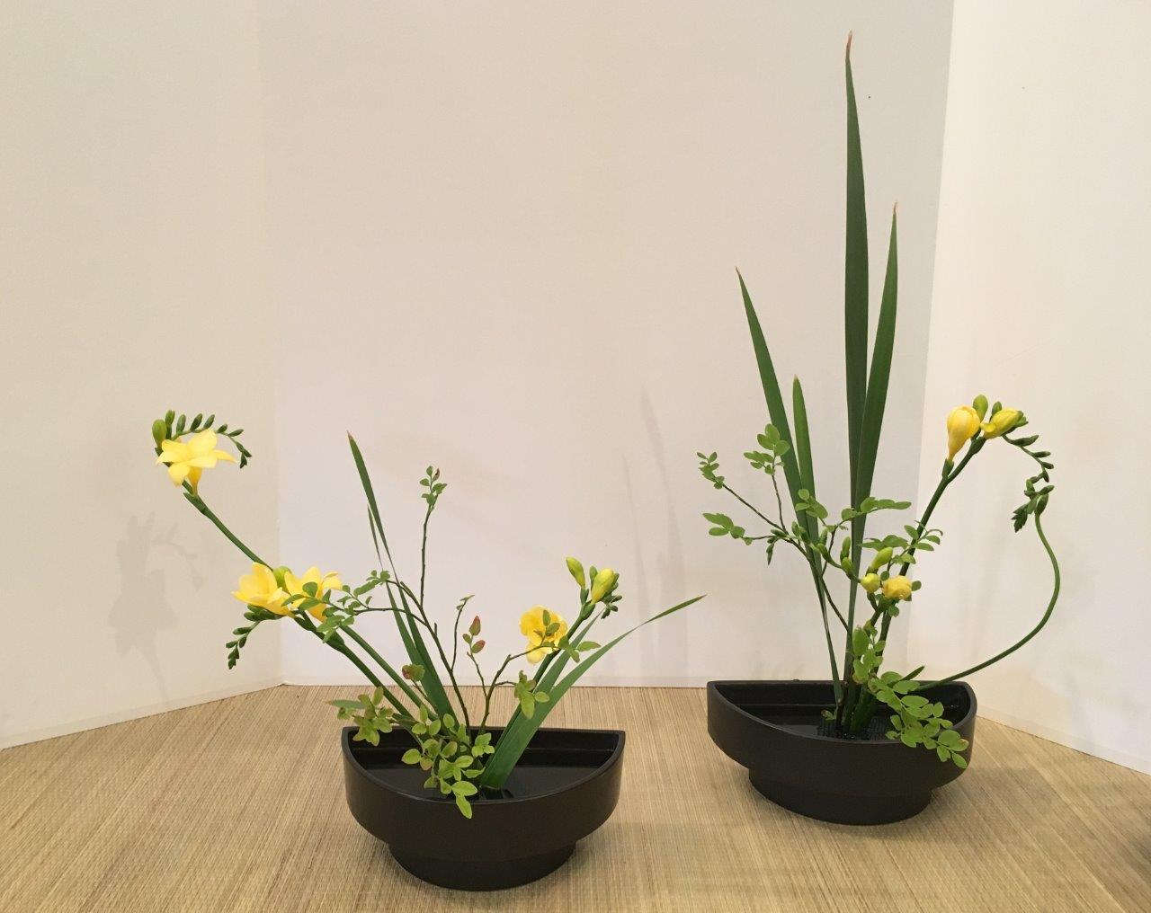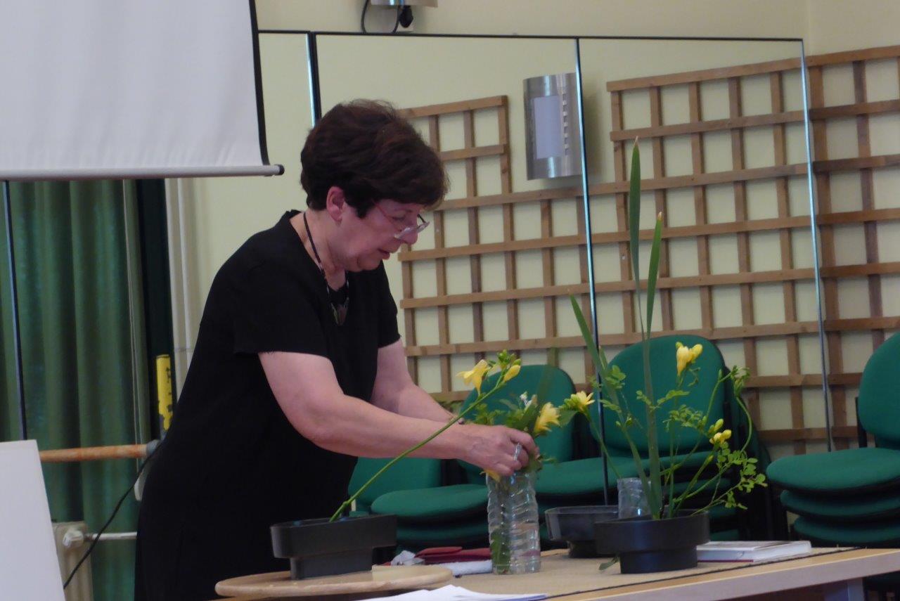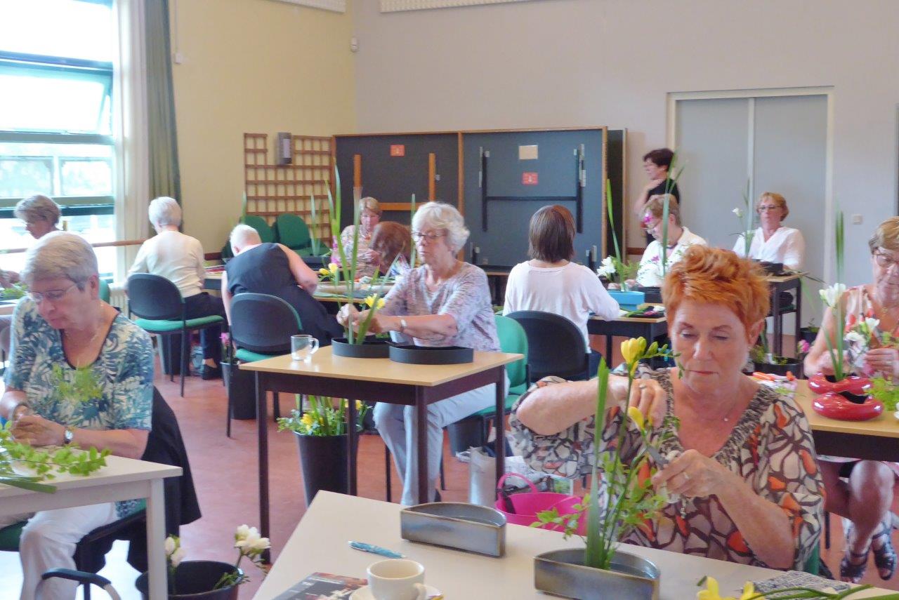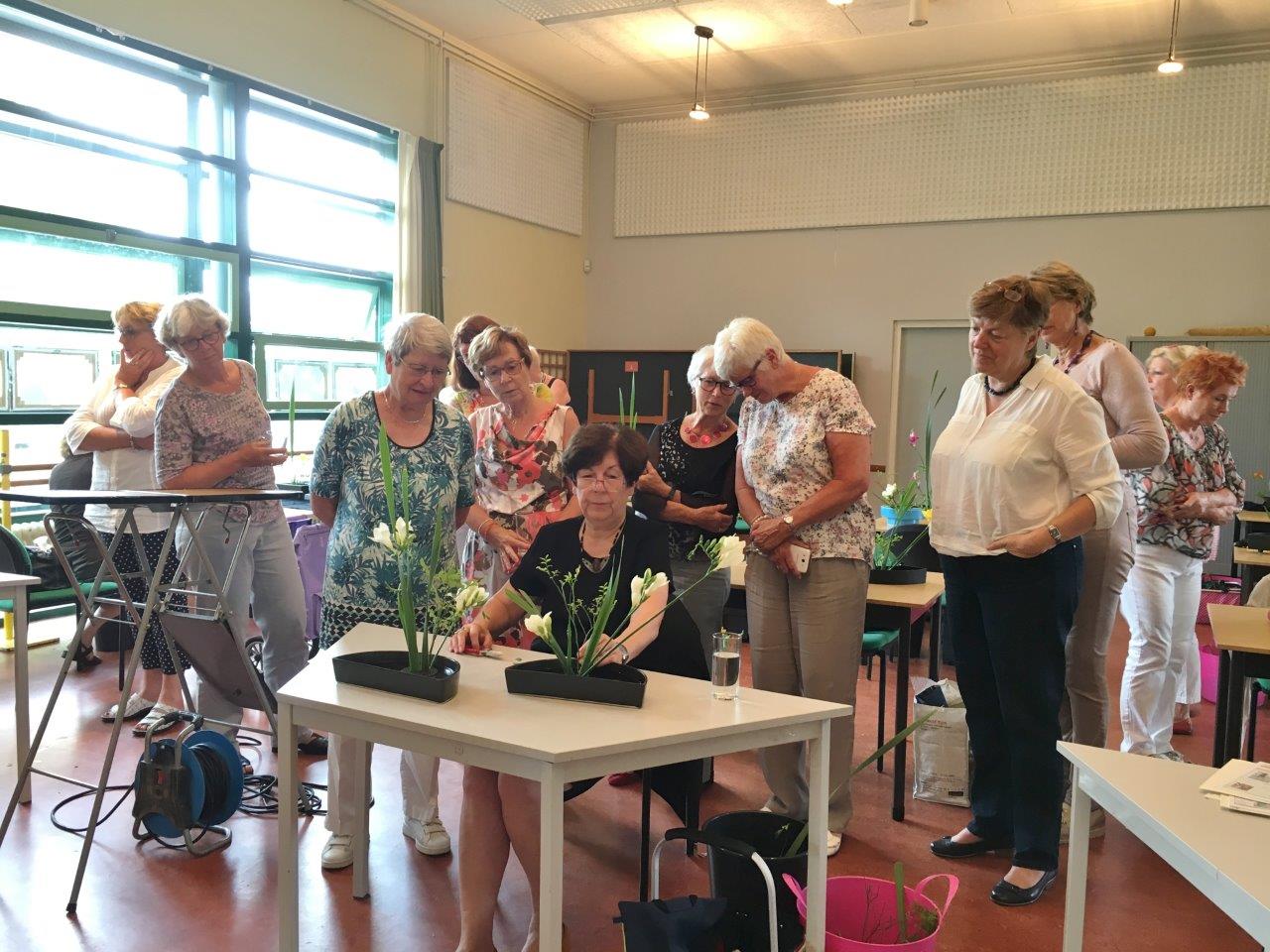 Greta Vervoort, president van het Ohara Chapter Belgiƫ verzorgde voor ons een workshop op zaterdag 24 juni 2017 in wijkcentrum Agora in Voorburg. Op het programma stonden twee eenvoudige vormen: een rechtopgaande en een hellende stijl. Voor beide schikkingen werd hetzelfde materiaal gebruikt, maar wel met verschillende functies in de schikking. Daardoor ontstonden er twee schikkingen die ieder afzonderlijk te bekijken waren, maar die ook goed als een geheel konden functioneren.