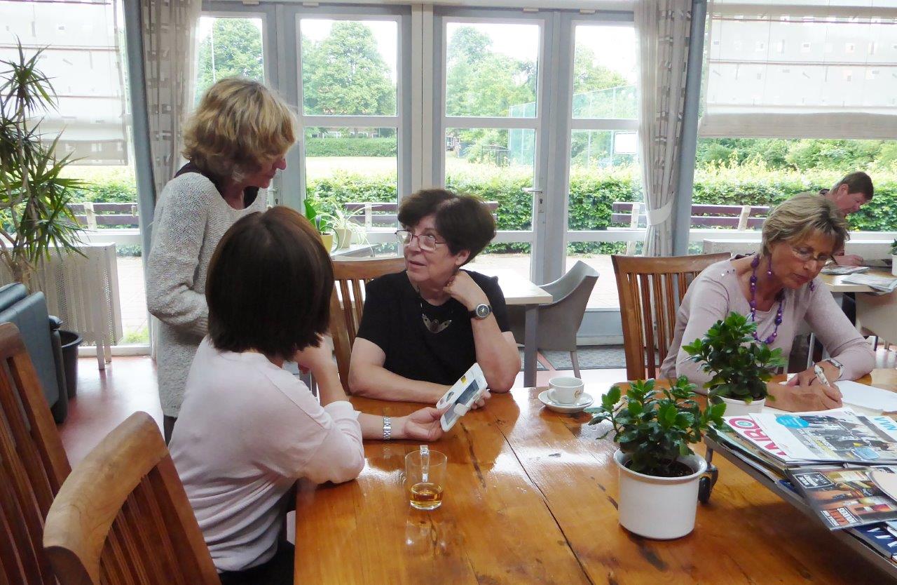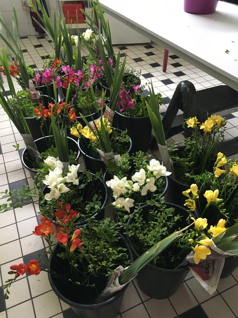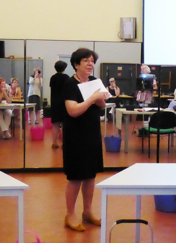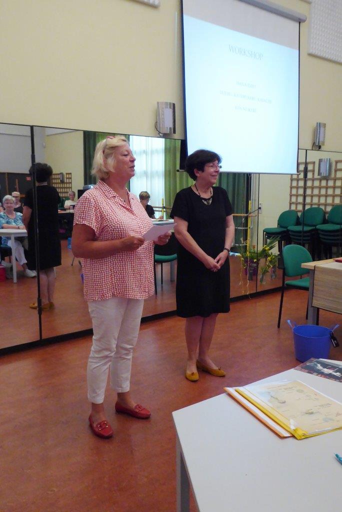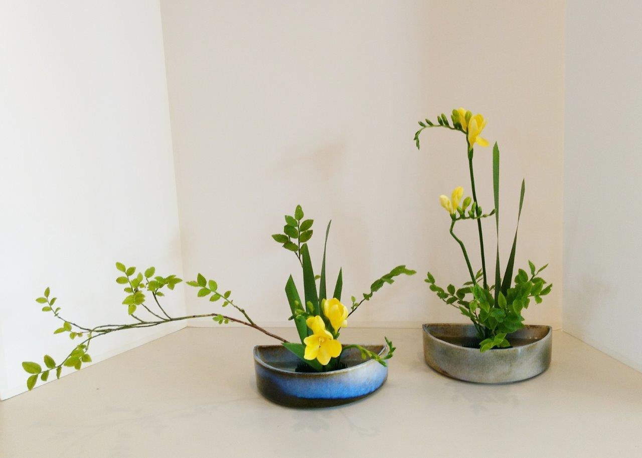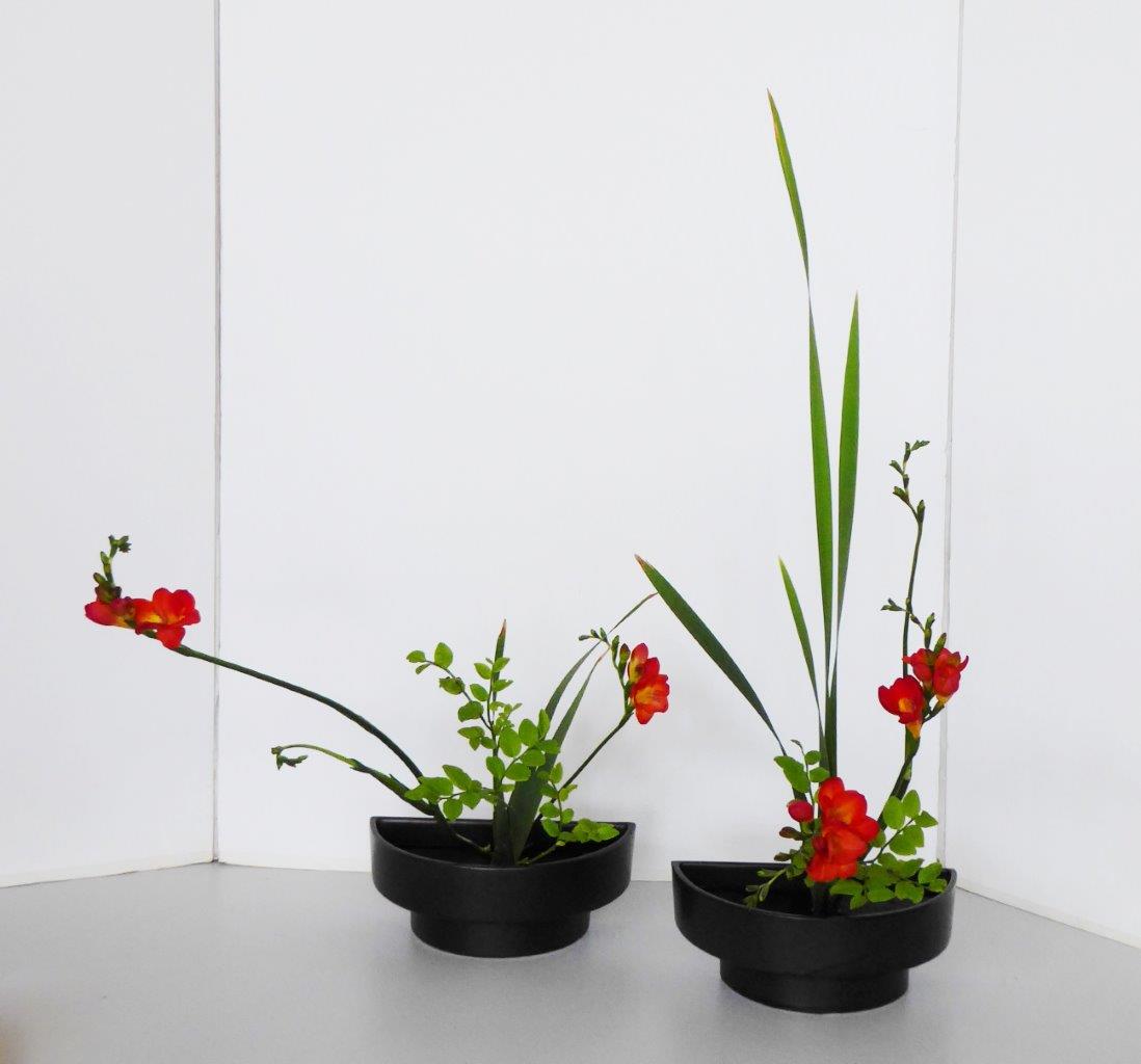 Greta Vervoort, president van het Ohara Chapter Belgiƫ verzorgde voor ons een workshop op zaterdag 24 juni 2017 in wijkcentrum Agora in Voorburg. Op het programma stonden twee eenvoudige vormen: een rechtopgaande en een hellende stijl. Voor beide schikkingen werd hetzelfde materiaal gebruikt, maar wel met verschillende functies in de schikking. Daardoor ontstonden er twee schikkingen die ieder afzonderlijk te bekijken waren, maar die ook goed als een geheel konden functioneren.
